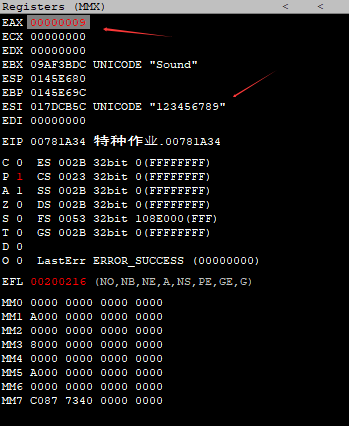 The password is then retrieved, and the debugger continues tracing until the accumulator register EAX contains the concatenated lengths of Sound and 123456789.